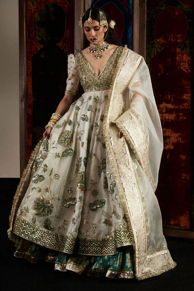 Elevate your style with our stunning Ivory Hand-Embellished Pishwaz, featuring vibrant emerald embellishments for a striking contrast. Paired with a show-stopping multi-color Chanderi Silk Sharara, this ensemble exudes timeless charm. Completing the look is a delicate pure organza dupatta adorned with intricate hand embellishments. This outfit beautifully blends tradition and elegance, ensuring you make a memorable impression!