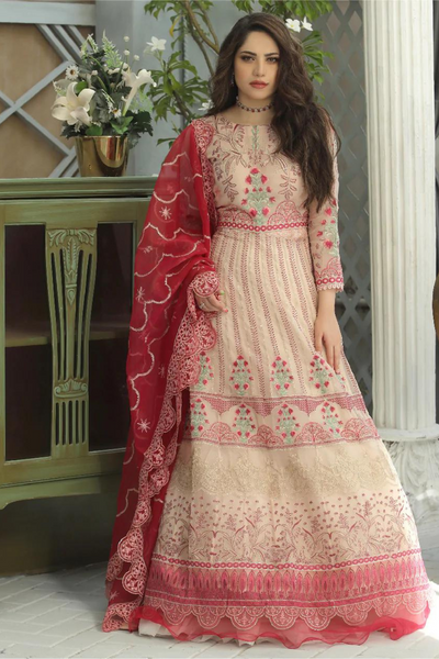 Description: Achieve dreamy perfection in 'ISLEEN'. A peach blush Maxi, richly embroidered with multi floral motifs, enchanting with contrast floor length frill. paired with a gorgeous scalp border dupatta to create a luxuriously beautiful ensemble. Color: Peach & Shocking Pink