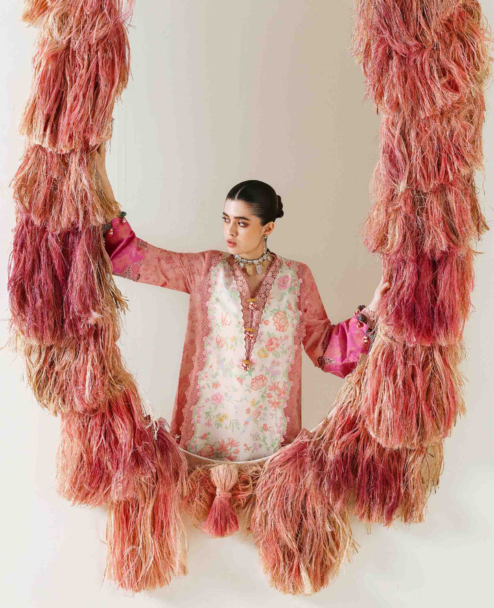 Color-blocked coral and white lawn shirt adorned with vibrant, colorful florals, creating a fresh and lively statement. Paired with a beautifully coordinated color-blocked dupatta, this unstitched ensemble is the perfect summer essential, blending breezy look.