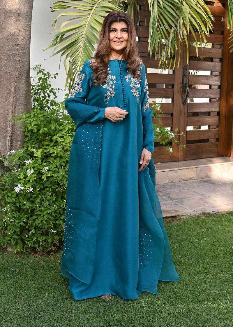 Elevate your style with the Aina ensemble, where classic femininity meets contemporary flair. Crafted from luxurious teal raw silk, the shirt flows gracefully, enhanced by hand-embellished detailing on the neckline and sleeves. Sleek cigarette pants offer a modern contrast, tailored to perfection for a sharp silhouette. Completing the look, the Kathan organza dupatta features scattered embellishments, adding an ethereal touch of elegance and movement. With no customization options and a 4–5 week delivery time, Aina is designed for effortless sophistication. Note: Color may slightly vary due to lighting and device settings