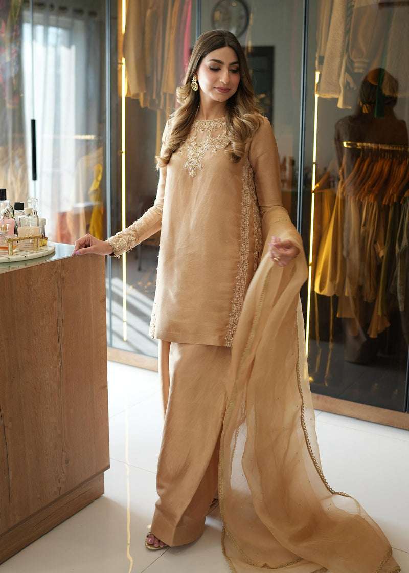 Anaya in gold is a radiant expression of luxury and timeless grace. Crafted from the finest raw silk, the kurta is adorned with intricate hand embroidery that enhances the richness of the golden hue. The flowing Farshi shalwar adds a majestic, traditional flair, while the sheer organza dupatta lends a soft, ethereal charm to the ensemble. Designed for those who appreciate refined craftsmanship and elegance, Anaya is perfect for making a regal statement at any celebration.