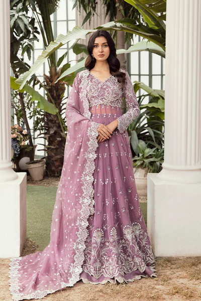 Rendered on a blissful dusty lilac canvas, this gown is intricately embellished with silver and lilac floral details. It is paired with a separate jacket that wraps around the bodice perfectly, luxuriously adorned with hand embellishments. The look is completed with a paneled raw silk lehenga and an embroidered organza dupatta featuring scalloped borders. The combination of delicate floral designs and rich textures creates an enchanting and sophisticated ensemble. Color: Dusty Lilac. From Amroz Atelier's 'Eunoia' collection, authenticity is guaranteed.