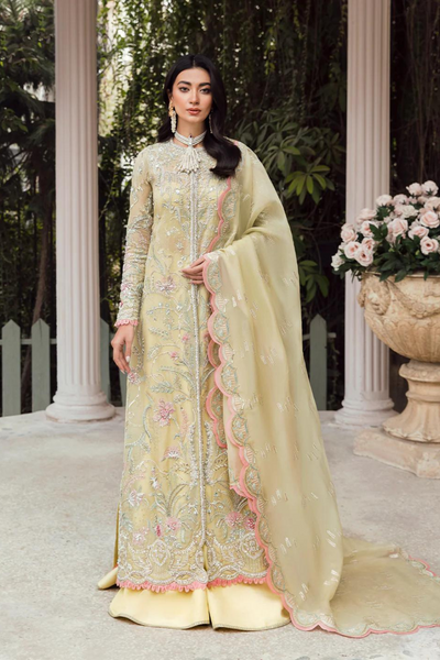 Presenting a spellbinding floor-length jacket in a mystical lime green shade. This intricately designed gown features pastel pink and green embroidery, luxuriously enhanced with hand embellishments. The ensemble is paired with a flared raw silk sharara and an embroidered organza dupatta, adorned with scalloped border details. The combination of rich fabrics and exquisite details creates an enchanting and elegant look. Color: Chartreuse Green. From Amroz Atelier's 'Eunoia' collection, authenticity is guaranteed.