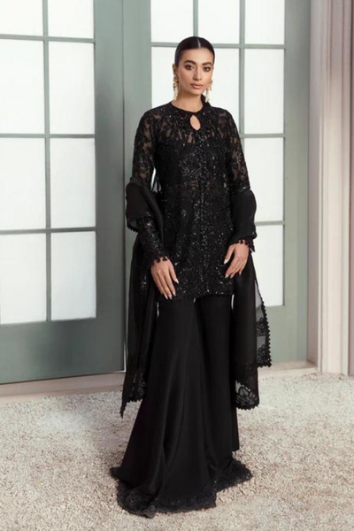 Presenting a timeless wardrobe classic in midnight black, radiating sheer elegance and crafted from pure net. This short-length jacket is intricately embellished with detailed embellishments on the front and sleeves, while the back showcases a spray of delicate motifs. It is paired with boot-cut pants and an organza dupatta adorned with embroidery and subtle embellishments along the borders, making it the perfect ensemble for evening soirees. Color: Midnight Black. From Amroz Atelier's 'Eunoia' collection, this outfit exudes sophistication. Authenticity guaranteed.