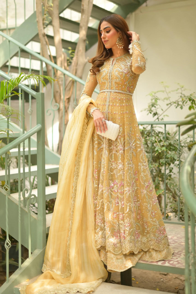 Crafted on a dreamy gold net canvas, this luxurious ensemble envelops the body in delicate grandeur. Adorned with scintillating silver and gold embroidery, along with intricate hand embellishments, it is a masterpiece of elegance. The fitted sleeves feature signature handmade tassels, enhancing the sophisticated appeal. The look is completed with a beautifully detailed organza dupatta framed with an intricate border, paired with a similarly hued raw silk shararah for an effortlessly elegant formal look. Color: Dusty Gold. This outfit from Amroz Atelier's 'Eunoia' collection exudes refined luxury. Authenticity guaranteed.