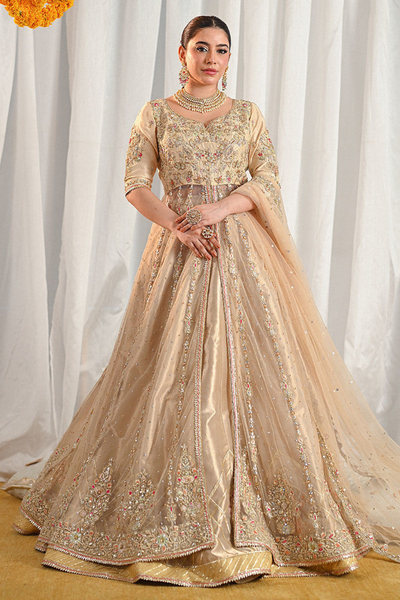 This sophisticated beige kalidaar, adorned with intricate golden thread work and dazzling gota embellishments, exudes timeless elegance. The delicate interplay of textures and hues creates a truly luxurious ensemble, perfect for special occasions. Crafted with precision, this outfit combines traditional craftsmanship with a modern flair, making it an exquisite choice for any high-profile event. With its impeccable design and attention to detail, this piece guarantees authenticity and originality.