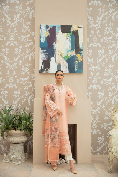 This stunning peach raw silk ensemble by AJR features delicate milky off-white and tone-on-tone Schiflee embroideries, complemented by sparkling diamonties, pleating details, and elegant laces for a sophisticated, refined look. The loose-cut paneled kurta pairs effortlessly with off-white pants, creating a relaxed yet polished silhouette. A statement printed organza dupatta completes the outfit, adding a layer of depth and vibrancy. Crafted from 100% original, authentic fabric, this outfit offers timeless elegance and is perfect for both formal and festive occasions.