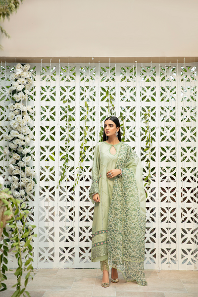 This pastel green outfit by AJR features a pleated Korean raw silk base, beautifully enhanced with intricate cutwork embroideries that exude sophistication. The keyhole neckline is elegantly embellished with crystals and Swarovski accents, adding a touch of luxury. Paired with a stunning organza printed dupatta, adorned with detailed insertion work, this ensemble makes a bold statement. Crafted with 100% original, authentic fabrics, this piece is perfect for those seeking timeless elegance and modern flair for special occasions.