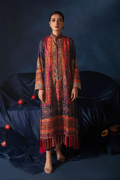 AMMARA KHAN's striking patterns and stellar play with a range of alluring hues leaves an unforgettable impression with this long silky tunic with a heavily embellished neckline with frayed band-collar detail. Sparkling sequins and beads add a flavour of luxe along with thoughtfully curated coloured tassels to complete the hemline. An exquisite style statement to step into the festive season.