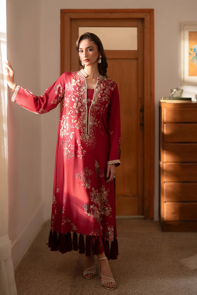Step into effortless elegance with Ammara Khan's Raspberry Floral Print from the Ronaq'25 collection. This stunning ensemble features intricate jewel work on the front and sleeves, exuding refined sophistication. The delicate tassels on the hemline add a playful yet graceful touch to the design. Paired with chic straight-leg pants, this outfit perfectly balances feminine charm and bold statement style. Crafted from luxurious blended silk, this 2-piece set (shirt and pants) is ideal for the modern woman who values both elegance and individuality. Perfect for making a stylish yet sophisticated statement at any occasion.