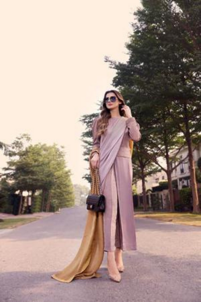 The 'Victoria' ensemble from A-MEENAH's A/W 21 collection is a captivating blend of jewel tones, featuring lavender and sublime mustard hues. Designed as a saree trousers suit silhouette, it is crafted on a pure raw silk base for a luxurious feel. The set includes a blouse, straight-fit trousers, and an extravagant extra-long saree palu, making it a perfect choice for winter soirees. Its elegant design and premium fabric ensure a timeless addition to your wardrobe.