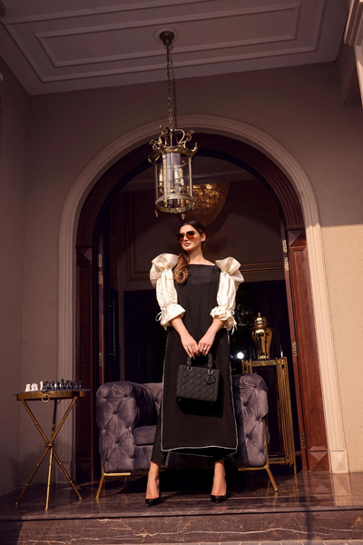 Inspired by the enchanting mod aesthetics of the 90s, ‘Elizabeth’ is a captivating piece that blends classic charm with contemporary style. Crafted from sumptuous raw silk fabric, the long silhouette in a striking midnight sooty palette exudes sophistication. The show-stopping puff and ruffled sleeves add a dramatic flair, making this ensemble truly unique. The outfit comes paired with an inner lining for comfort and a classic straight-fit trouser to complete the look. The ensemble is finished with a luxurious silk dupatta, enhancing its timeless elegance.