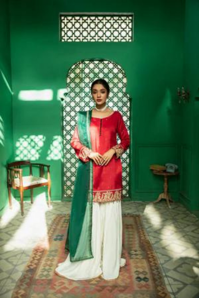 The 'Mishri' ensemble from A-Meenah's Luxury Pret'22 collection is a dream-like ode to traditional South Asian aesthetics. This exquisite outfit combines a cotton silk shirt in a delightful mix of crimson, ivory, and emerald green, paired with viscose trousers and an organza dupatta. The minimal yet elegant design makes it a splendid choice for any festive season event, exuding timeless charm and sophistication.