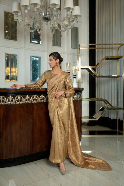 Bask in the glorious palette of medallion and butterscotch golds with ‘PARISA’. A pant saree silhouette includes a choli which is hand rendered with motifs and intricate embellishments. Paired with an opulent tonal jamawar trouser and saree pallu makes for a contemporary twist on a classic outfit.