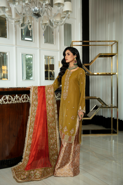 SHAMS by A-Meenah redefines elegance with its sumptuous pine-hued base, beautifully adorned with blooming baroque imagery and intricate motifs. The design features delicate handwork in a palette of dull gold dabka, accentuated with precious stones for a luxurious finish. This captivating formal outfit is paired with a sumptuous jamawar sharara pant and a royal ruby-hued masuri dupatta, complete with signature kiran gotta finishing. Crafted from 100% original, authentic fabric, SHAMS is the perfect choice for making a statement at any formal occasion with timeless sophistication.