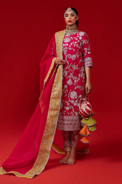 A pink heavenly embroidered shirt with capri trousers are adorned with sequins work. It is paired up with a pink organza dupata framed with yellow and golden embroidered borders. Colour: Pink