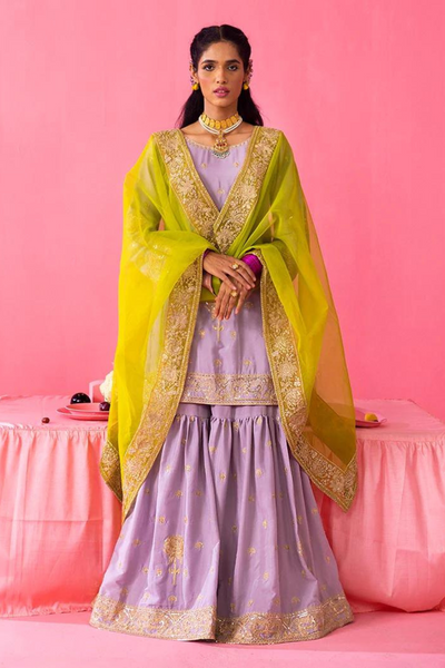 A grey silk shirt and gharara have beautiful gold aari embroidery and sequins work on it. The shirt has leather tassels and is paired up with a green organza dupatta with embroidered borders. Colour: Grey and Green