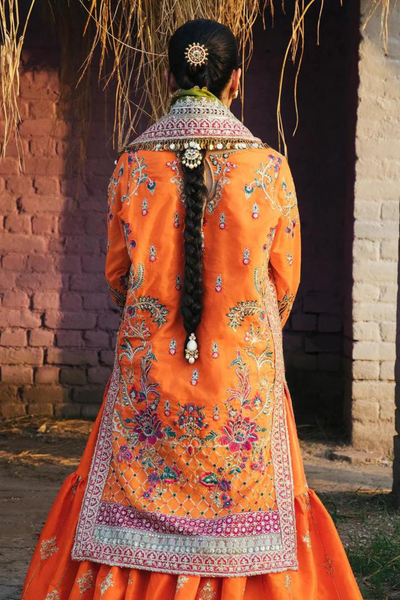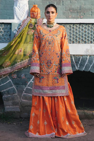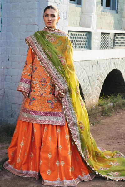 This Ali Xeeshan Shabo Shehzadi unstitched 3-piece outfit is a stunning combination of tangerine and green hues. The rich tangerine shirt is adorned with multicolored floral motifs, enhanced with gold sequins and tilla work, creating a vibrant and luxurious look. The embroidered gharara is paired with a dhani green organza dupatta, beautifully framed with a delicate border. The set includes embroidered cotton net front, back, and sleeves, with intricate organza borders for added elegance. The ensemble also features raw silk trousers with an embroidered border, offering a perfect balance of tradition and contemporary style. 100% Original craftsmanship.