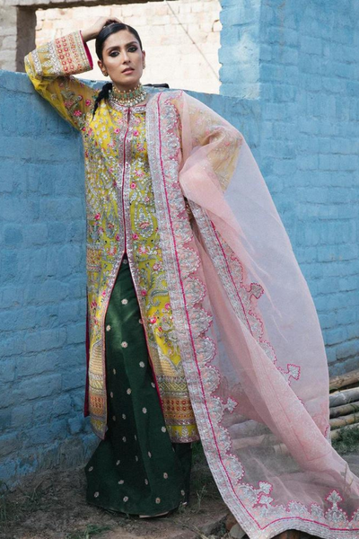This Ali Xeeshan Shabo Shehzadi unstitched 3-piece outfit is a masterpiece in salmon pink, crafted on an organza base. It features mesmerizing gold, tilla, and sequins embellishments, with embroidered organza front, back, and neckline patch. The design is further enhanced with embroidered panels A and B, along with organza sleeves and a finished dupatta adorned with intricate motifs. The set includes 3.25 yards of dyed viscose silk lining and 2.5 yards of raw silk trouser. This elegant peach-colored pishwas blends traditional craftsmanship with modern elegance, offering a luxurious, timeless addition to any wardrobe. 100% Original.