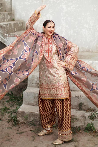 This stunning ensemble features a rose gold masoori shirt adorned with a beautifully architectural-inspired design, seamlessly blending floral motifs crafted in gold tila and sequins. The shirt's neckline and hem are highlighted in a rich rust color, adding depth and contrast to the soft rose gold. The matching trouser, made from maroon raw silk, features a vertical chevron pattern with intricately embroidered borders, offering a sleek yet sophisticated touch. To complete the ensemble, the outfit is paired with a multi-colored dupatta with delicate embroidered borders, adding vibrancy and elegance.