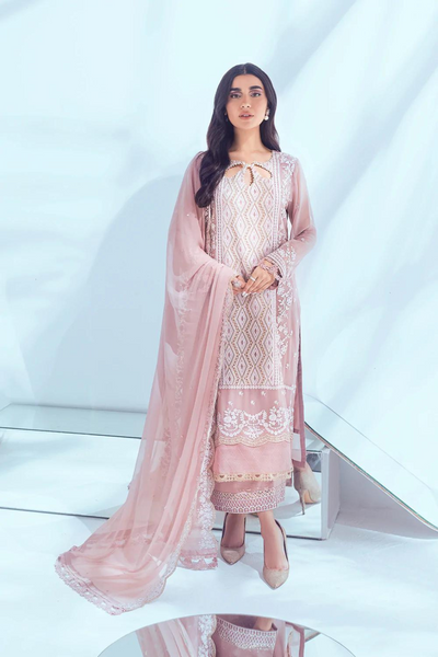 Unstitched Sequins Embroidered Chiffon Front: 1yard Sequins Embroidered Chiffon Sleeves: 0.65yards Dyed Chiffon Back: 1.25yards Sequins Embroidered Chiffon Dupatta: 2.5yards Embroidered Trouser Border: 1 Meter Dyed Bottom Fabric: 2.5yards Shirt Length with Border: 43”+ Inner Fabric Included Fabric: ChiffonColor: Pink