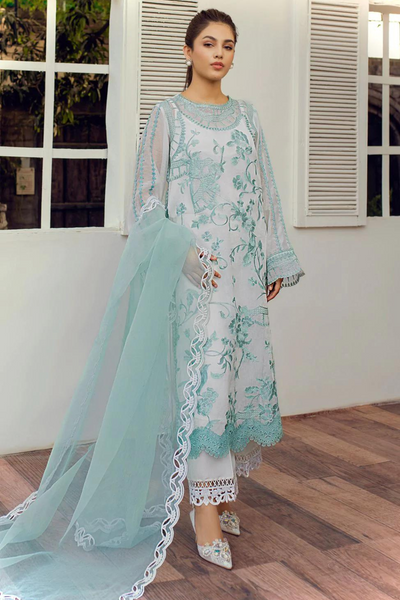 This stunning white cotton silk net long shirt features beautiful gara-inspired embroidery in hues of blue, adding a touch of timeless elegance. The intricate lace details along the shirt's edges enhance its refined look. The ensemble is paired with a dupatta, which is elegantly embroidered and finished with cutwork all around, completing the graceful design. The shirt also includes a slip underneath for added comfort and modesty. This sophisticated piece is ideal for festive occasions, combining traditional artistry with contemporary style.
