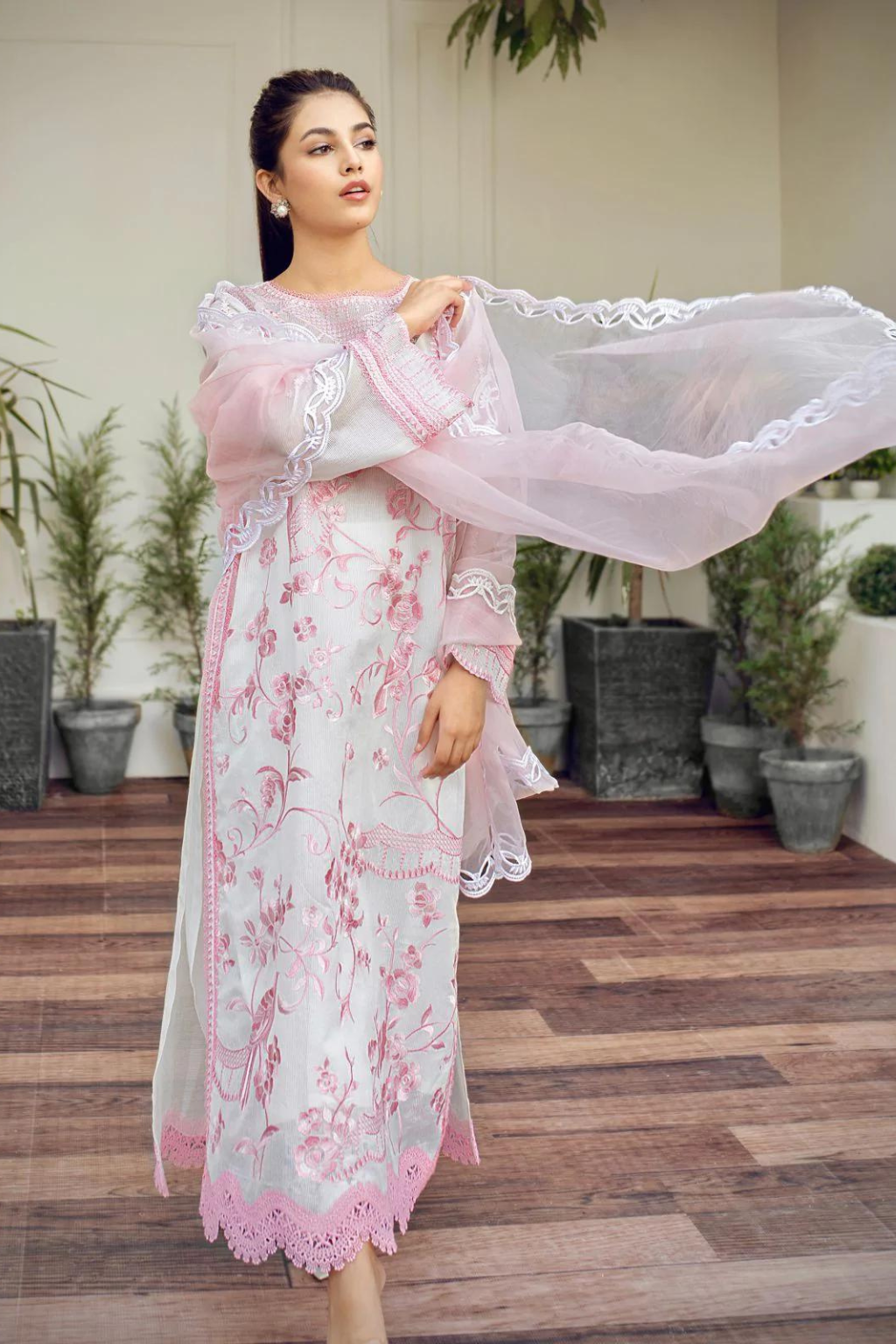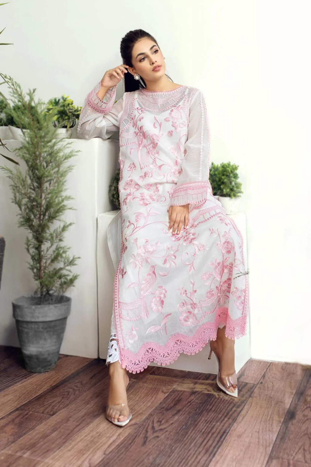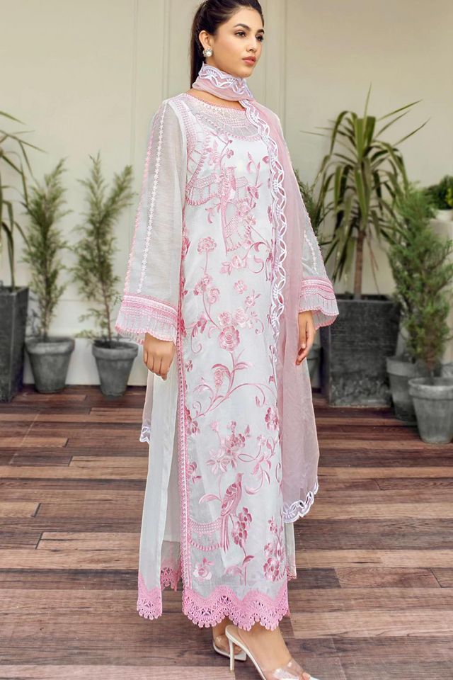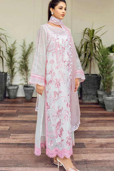 This exquisite white cotton silk net long shirt features delicate gara-inspired embroidery in soft hues of pink, offering a blend of tradition and elegance. The intricate lace details along the edges of the shirt add a refined touch, enhancing its beauty. Paired with an embroidered dupatta that showcases elegant cutwork all around, this outfit exudes grace. The shirt also includes a slip underneath for added comfort and modesty. Perfect for festive occasions, this ensemble brings together classic design and modern sophistication.