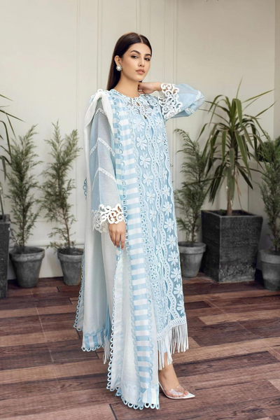 A beautiful sky blue cotton silk net long shirt with embroidery,mirror work and lace fringe details. Comes with a dupatta with printed and lace details all around. Shirt includes a slip underneath.