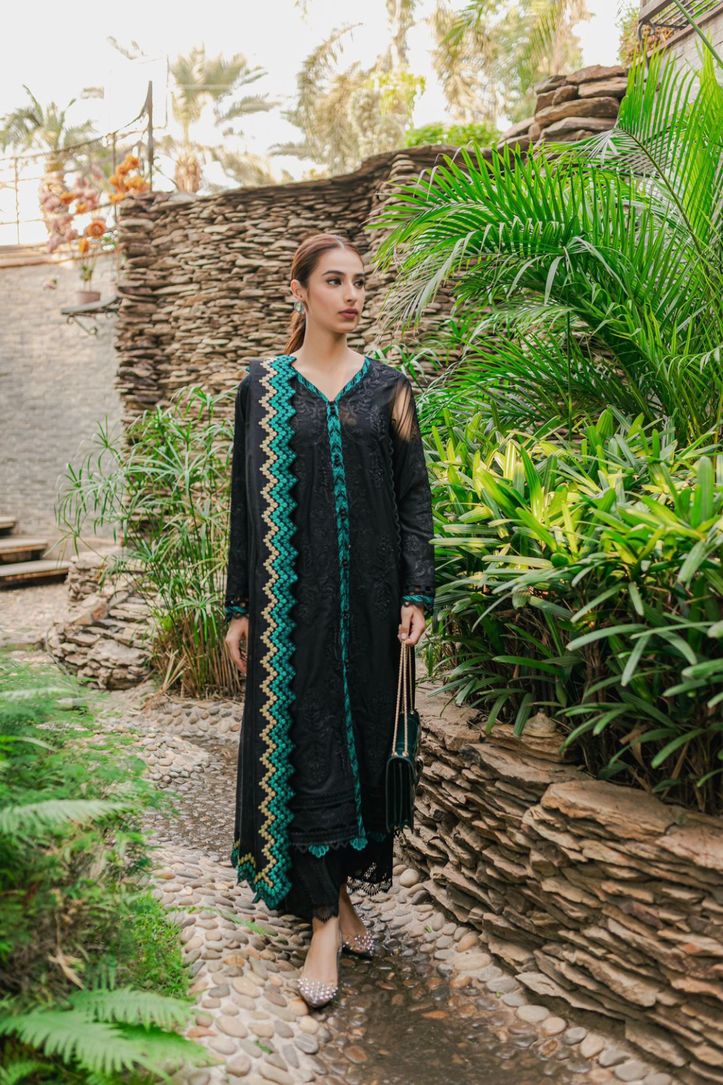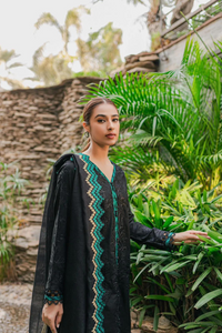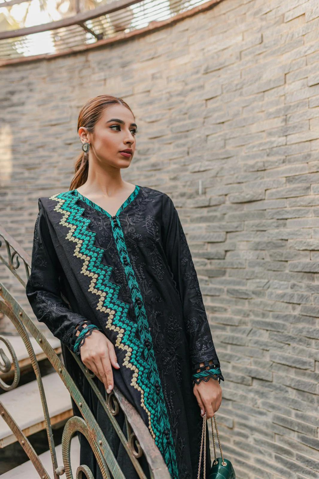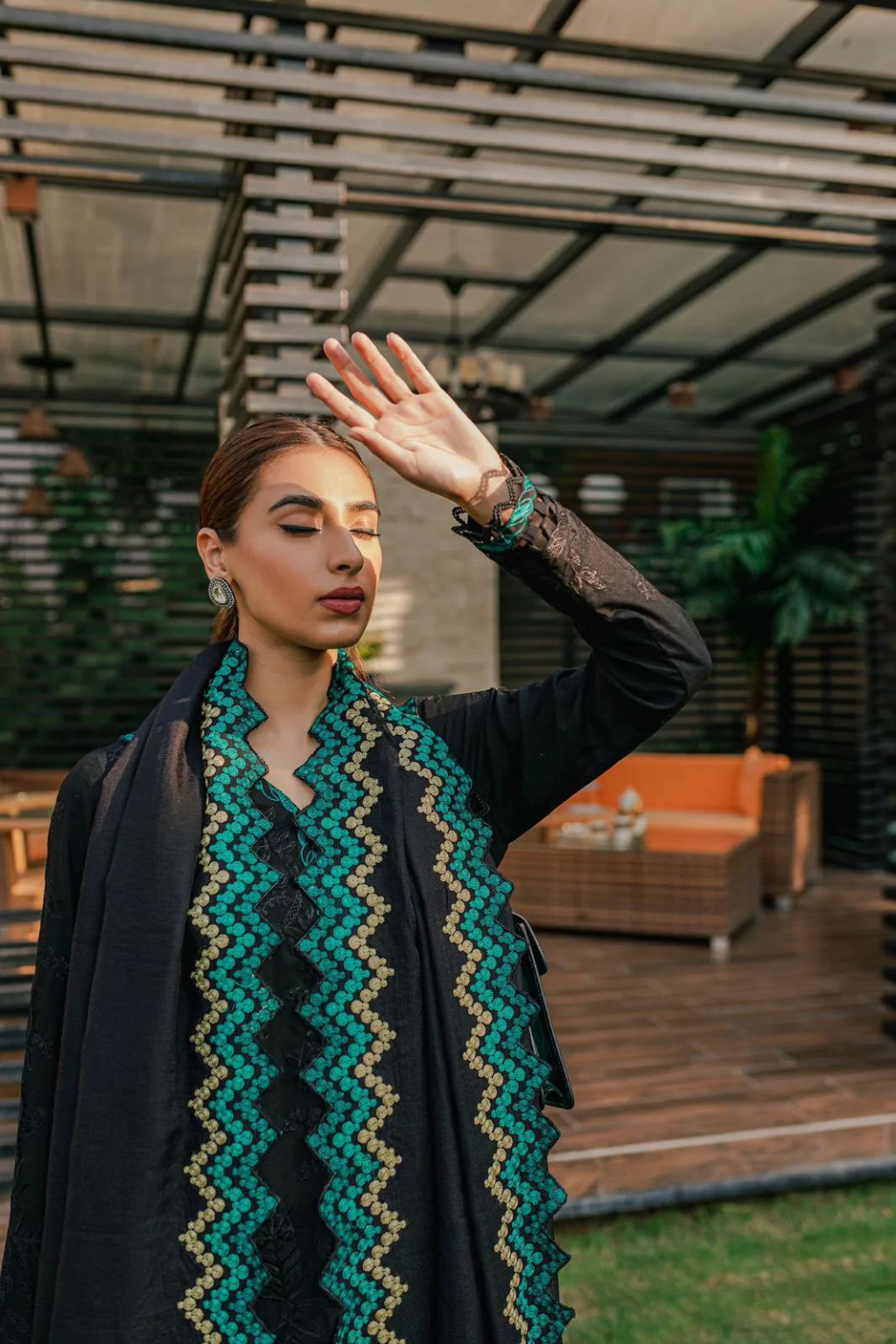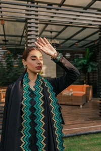 Baraekhanom Winter Edit'22 offers a refined ensemble featuring a pure soft karandi shirt, providing a smooth and comfortable texture. It is paired with pure cotton khaddar pants, ensuring warmth and durability. The outfit is complemented by a cotton net organza dupatta, adding an elegant touch of sophistication. Authenticity guaranteed.
