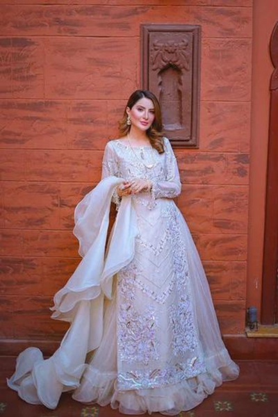 Nyla Rajah stuns in our signature ivory,ethereal ensemble intricately detailed in mukesh,milky stones,richly carved beads, crafted to perfection with a crushed organza lower!