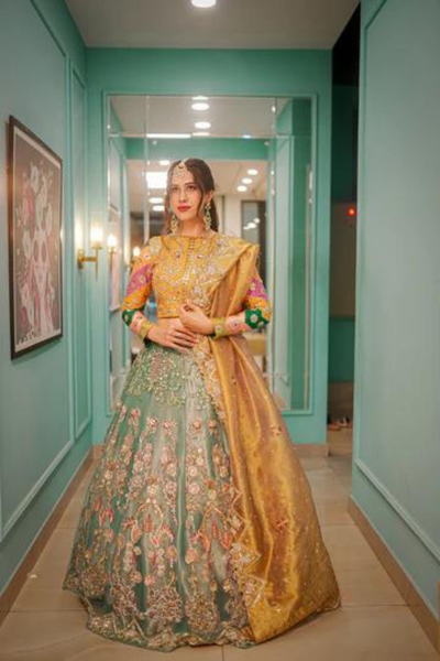 @adenrehan looks ethereal in our latest ocean blue tissue lehnga paired with Indian yellow choli with hints of zinc, coral pink and lavender.The immaculate detailing of gota,zadozi and mukesh makes it perfect for mehndi and Sangeet! Look is completed with tissue duptaa with worked borders.