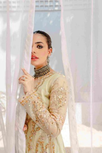 Lata demonstrates a dreamy, long, front open silhouette made out of net, adorned with intricate embroidered details in soothing mint green. The straight fit pure tissue pants also worked with chunky embellishments, and an evening handmade clutch, completes the whole look to create a style statement.