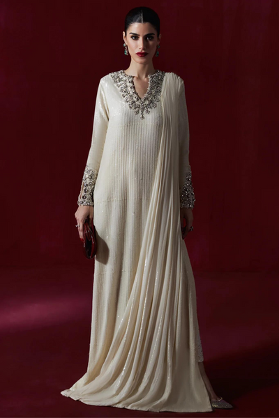 Poussière de Lune is an exquisite masterpiece, crafted from the finest chiffon in a soft, ethereal hue that glimmers with intricate hand embellishments. The luxurious frosted chiffon drapes the body with delicate grace, while a cascade of scintillating sequins adds a mesmerizing touch of opulence. The meticulously draped dupatta, adorned with sequins, is elegantly fastened to the shirt, creating an effortlessly regal and formal look. Perfect for a grand occasion, this ensemble combines ethereal beauty with timeless sophistication. Elan - Lumière'24 guarantees 100% authenticity, with pre-booked orders delivered in 12 weeks.