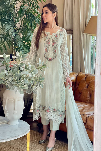 A timeless vision of romantic glamour, this pale blue embroidered cotton net ensemble features intricate thread work and kamdani embroidery, showcasing exquisite craftsmanship. Designed for those with the finest aesthetic, it exudes understated elegance. The delicate embroidery adds a sophisticated touch, while the ensemble remains classic and timeless, making it a wardrobe staple for any occasion. Paired with matching Pk silk pants, this piece effortlessly blends traditional artistry with modern grace.