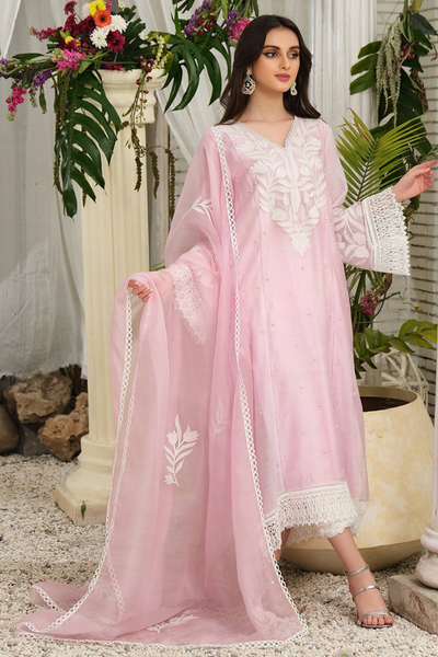 This enchanting lilac cotton net ensemble is a perfect blend of elegance and sophistication. Adorned with delicate pearls, tarkashi detailing, and intricate lace, the neckline and sleeves are beautifully enhanced with dreamy appliqué. The ensemble is paired with a contrasting slip and a graceful dupatta, creating a refined look that's perfect for any special occasion. The meticulous craftsmanship and luxurious fabric make this outfit a timeless choice for celebrations and gatherings, offering both comfort and style with every wear.