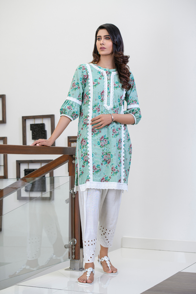 This classic green Irish cotton kurta is enhanced with vibrant printed florals and delicate lace finishing, adding a touch of elegance and charm. The fresh floral design beautifully complements the soft, breathable fabric, creating a timeless piece that effortlessly blends style and comfort. Perfect for casual or semi-formal occasions, this kurta offers a versatile and chic look.