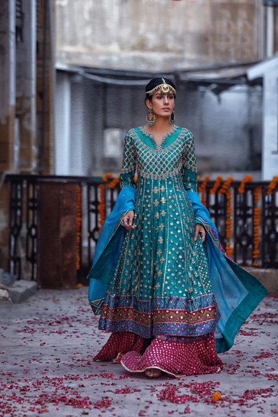 This festive emerald green kalidar by Faiza Rehman exudes traditional elegance, making it perfect for mehndi or wedding occasions. The ensemble is richly adorned with intricate resham, zardozi, and gota work, reflecting exquisite handcraftsmanship. Hand-embellished borders in printed pure silk elevate its visual appeal, adding a luxurious touch. Each detail is thoughtfully designed to capture the essence of festive celebration. Made from 100% original, authentic fabric, this kalidar is a timeless piece that blends heritage artistry with contemporary flair for the modern woman who values tradition and grace