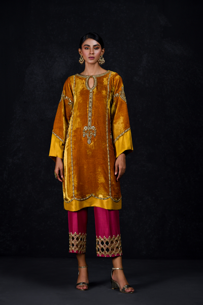 A navy blue raw silk shirt with appliques and traditional motifs, encrusted with handwork, gold sequins and zardozi work, paired with pure raw silk pants.