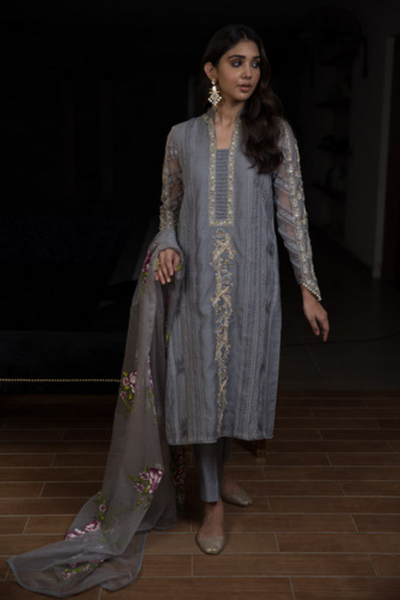 An exquisite brown ensemble. Featuring detailed Mukesh work, embroidery, and hand embellishments, this number comes up with a kamdani and lace striped organza shirt decorated with plain organza sleeves.
