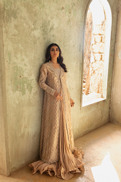 Our delicately crafted red kalidaar ensemble oozes traditional craftsmanship comprised pf lace net vanished with kamdani and zardozi work with pearls hanging on the order. The lace panels are enhanced with delicate mukesh work and zardozi cutwork sleeves and elegant finesse.
