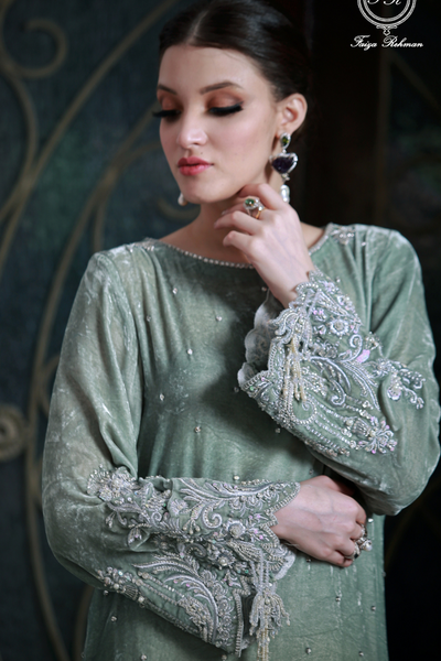 This maroon zari khadi net angarkha is a masterpiece of craftsmanship, intricately designed with luxurious details. The stunning zardozi-worked peacocks, magnified with gold tassels, add a regal touch, while the delicate kamdani work on the sleeves enhances its timeless elegance. The fusion of traditional techniques and opulent embellishments makes this angarkha a statement of sophistication and grandeur. Perfect for special occasions, it exudes an aura of rich heritage and modern allure. Faiza Rehman brings you this impeccable creation, showcasing unmatched artistry and 100% original craftsmanship.