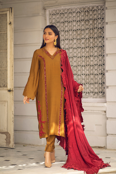 This refined brown ensemble showcases intricate embroideries with hand-embellished beads and sequins along the hem, accentuated by elegant motifs and beautiful detailing. The cotton silk shirt is delicately handworked with deep red motifs, offering a stunning contrast. Paired with matching cotton silk pants, this sophisticated set exudes timeless elegance, perfect for festive occasions or upscale events.