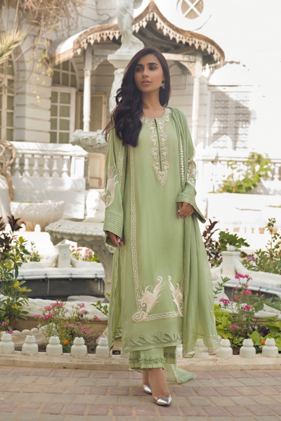 The serenity of green comes alive with this elegant design, featuring exquisite hand-embellished embroidery on the neckline and shirt. This ensemble boasts an apple green cotton silk shirt adorned with sophisticated off-white motifs on the sleeves and daman, creating a graceful and timeless look. Perfect for any occasion, this design blends understated elegance with delicate detailing for a refined style.