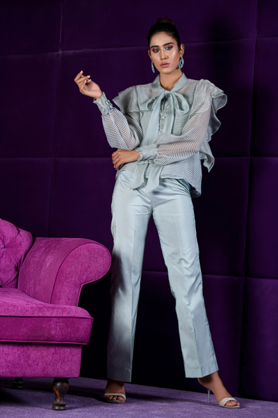 This sea salt-colored ensemble features a striped organza shirt adorned with intricate zardozi work, a chic neck bow at the front, and frills around the shoulders for a touch of elegance. The cuff sleeves are detailed with handcrafted bug motifs, adding a glamorous and unique flair to the overall look. Perfect for making a sophisticated statement, this design combines luxurious craftsmanship with modern style, ideal for those looking to stand out in festive occasions.