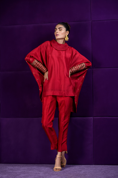 This bold red turtle neck top in pure raw silk features a contemporary butterfly cut, elevated with glistening hand embellishments for a striking effect. The sleeves are enhanced with intricate organza manipulation and sequin detailing, adding just the right amount of pizzazz to the refined silhouette. A standout piece from Faiza Rehman, it effortlessly combines elegance with a modern edge, making it perfect for festive occasions or statement eveningwear.
