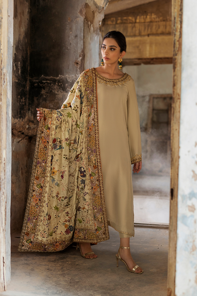 This iridescent ivory shikargah shawl is a true statement of elegance, adorned with intricate Resham work and finished with a masterfully rendered zardozi border on pure silk. Measuring 32 to 35 inches in width and 2.75 yards in length, it adds regal charm to any ensemble. Paired with an ivory pure raw silk suit featuring delicate zardozi finishings, this refined set embodies timeless sophistication. Perfect for formal occasions, it celebrates artisanal craftsmanship with a graceful, ethereal touch.