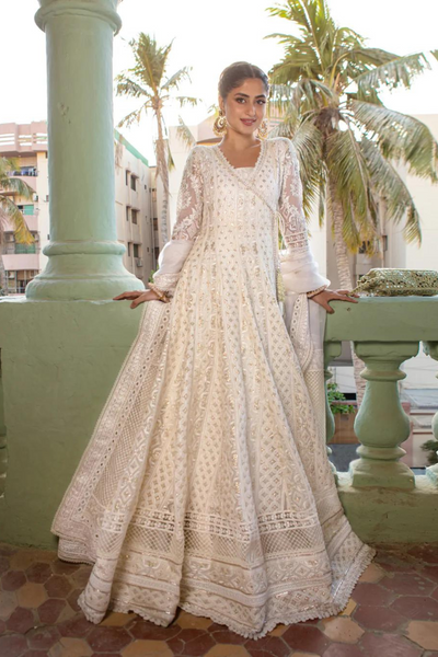 A three piece kalidaar angrakha in white wrought using a richly embroidered fabric featuring laces and glistening embellishments. Handcrafted with meticulous care, our pieces have a lot of diligence and love invested in them. The exquisite craftsmanship requires laborious hours.