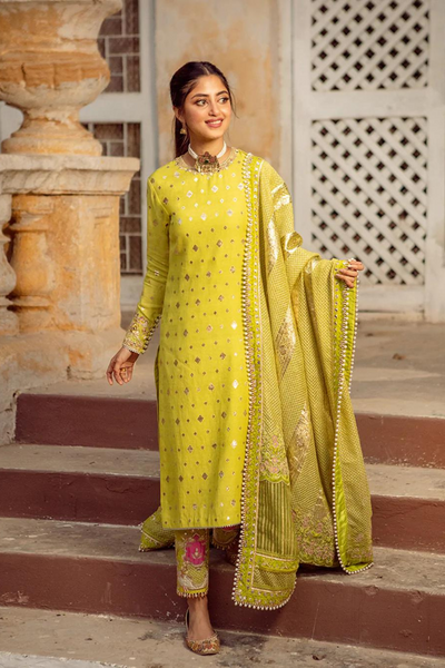 A three piece lime yellow long kameez and patch worked pyjama set, paired with a sumptuously embroidered dupatta featuring intricately embroidered floral trellises and shimmery stripes. Handcrafted with meticulous care, our pieces have a lot of diligence and love invested in them. The exquisite craftsmanship requires laborious hours.