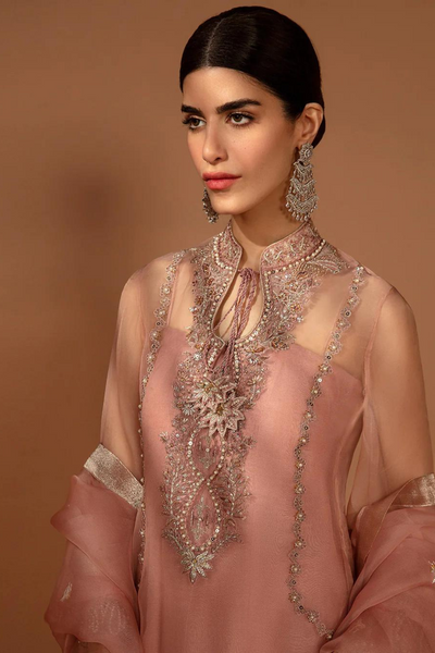 Auset from Faiza Saqlain’s Aleira'24 Evening Edit beautifully blends artisanal craftsmanship with FS’s signature design sensibility. The delightful peach-hued organza shirt is adorned with intricate patterns of resham and dabka, exuding elegance and refinement. Paired with Korean raw silk culottes, the ensemble achieves sartorial perfection. The embellished organza dupatta completes the look with a touch of grace and sophistication. Authenticity is guaranteed, making Auset a standout choice for those seeking timeless charm and impeccable style for special occasions. It's truly a celebration of sophisticated artistry!