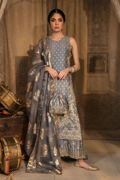 This pale blue set from Faiza Saqlain's Festive Edit'22 collection is a delicate and elegant choice. Crafted from silk tissue, the shirt is adorned with small bootis and brimming floral trellises, exuding charm and sophistication. The ensemble is completed with a sheer organza dupatta, self-embellished and edged with gotta patti, and embroidered Korean raw silk trousers. Perfect for festive occasions, this outfit combines premium fabric with intricate craftsmanship, making it a timeless addition to your wardrobe.